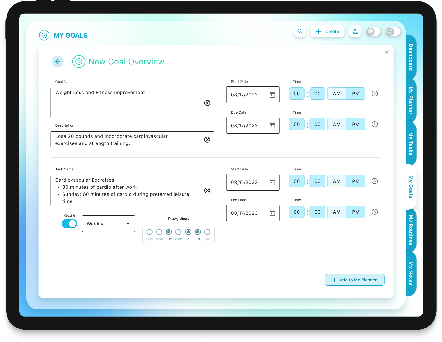 Develop a handwriting planner app for iPad that offers a user-friendly interface featuring a distraction-free mode, incorporates AI-powered assistance that breaks down long-term goals into actionable tasks, and assigns specific days and times for each task. A personalized, immersive, tactile experience empowers users, eliminates distractions, streamlines planning processes, and ultimately enables users to effectively manage their time, achieve their goals, and reduce stress.